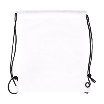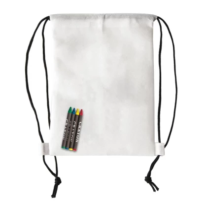 Plecak z materiału non woven w białym kolorze do samodzielnego kolorowania. Wyposażony w 4 kredki woskowe w kolorach: czerwony, niebieski, żółty i zielony.